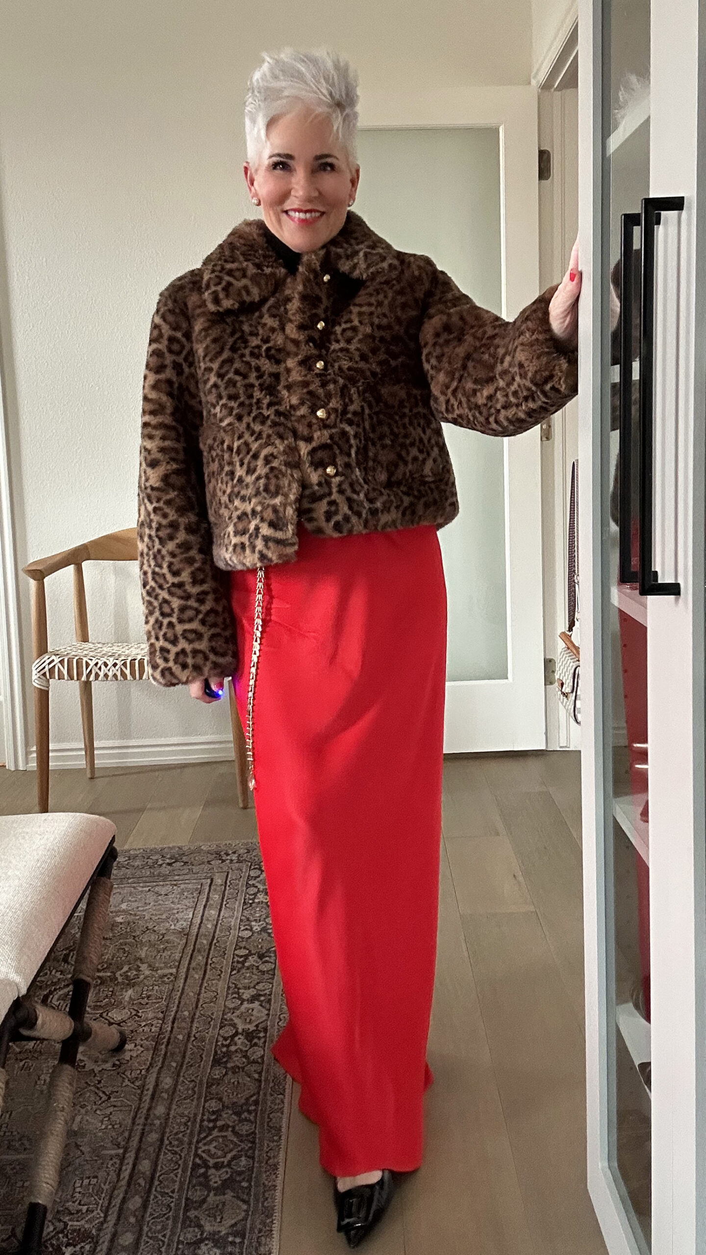Lastly, I went for timeless elegance. I paired it with a classic cashmere turtleneck sweater, a faux fur leopard jacket, and ladylike black kitten heels. The jeweled belt finished it off just right, adding a touch of glam.