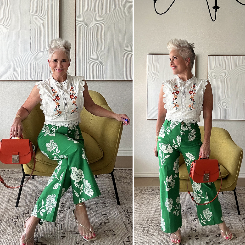 Let’s chat printed pants………. specifically THESE ADORABLE GREEN FLORAL CROPPED PANTS from Anthropologie. They’ve been one of their most popular styles for a reason! I own many, many pairs because the fit is perfection, I feel they were made for me! And the comfort? Off the charts! I’m not kidding when I say, they’ll be on repeat for me this spring and summer!