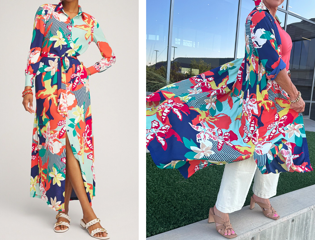 Next up is this cutest FLORAL SHIRTDRESS. Isn’t it fun? The colors and print are so bright and punchy…. instantly lifting anyone’s spirits! One of my favorite ways to style a shirtdress is to wear it open like a kimono. It’s such a chic and effortless way to add a bit of flair to some jeans and a tee-shirt. Whether you’re meeting some friends, or going to the office….. even a date night, there is a way to wear this dress! It’s sure to make a statement! See how I styled it here as a swimsuit coverup and as a dress with some fabulous metallic booties!!!!!!