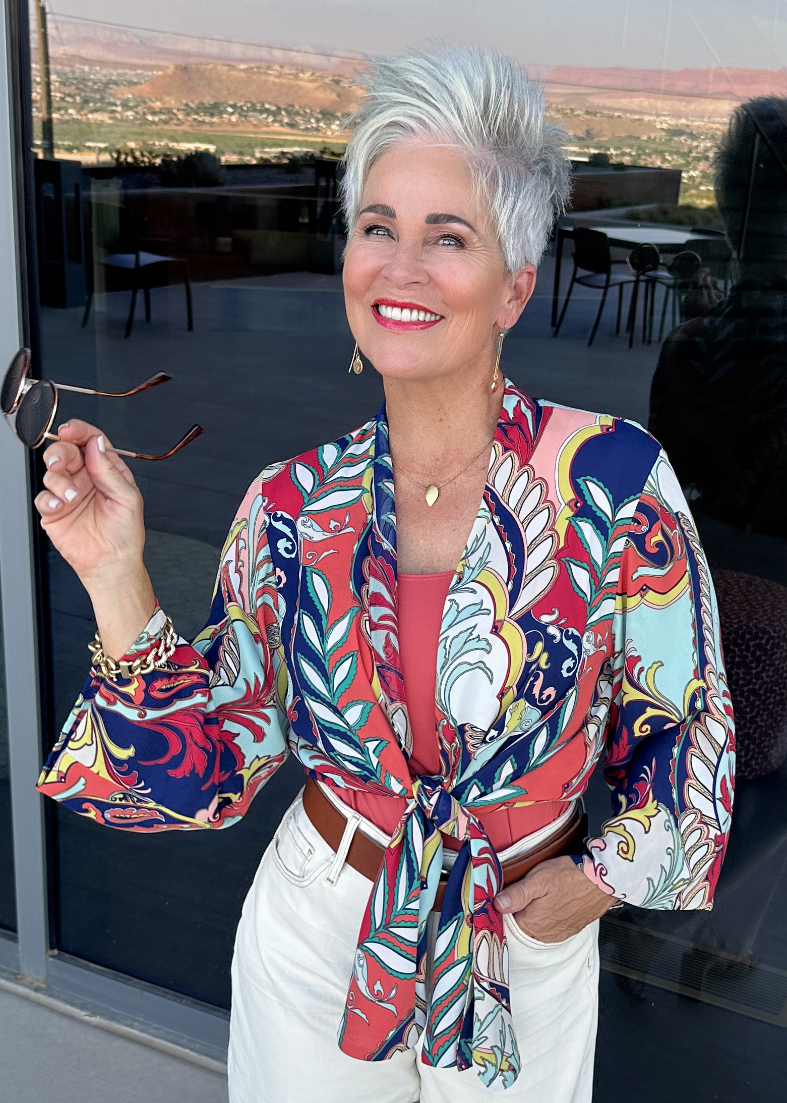 First up is this VIBRANT TOP, actually a kimono. It’s a true showstopper, and has the option to tie it in front as I have, or leave it down and flowy. It’s versatile enough for any occasion. The playful design and bright colors are what caught my eye, and perfect for fall. Style it with jeans, or pants, heels, or sneakers. See my ideas here……