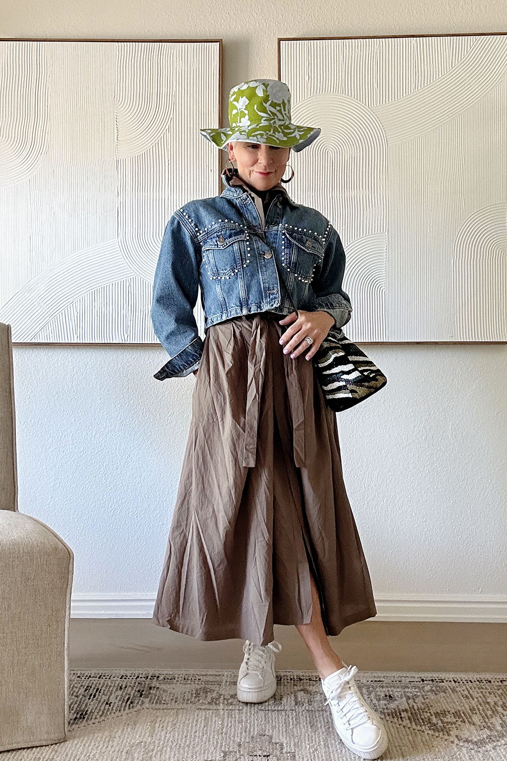 In addition to these two looks, I switched things up with a pearl-embellished denim jacket, comfy sneakers, and a colorful bucket hat. This gives it a cool, laid-back vibe, which is just right for those days when I’m on the go, exploring a new city, or running errands. The jacket and sneakers add a youthful touch, while the hat brings in that extra bit of fun! I’m almost positive it will be coming with me to Europe this fall!