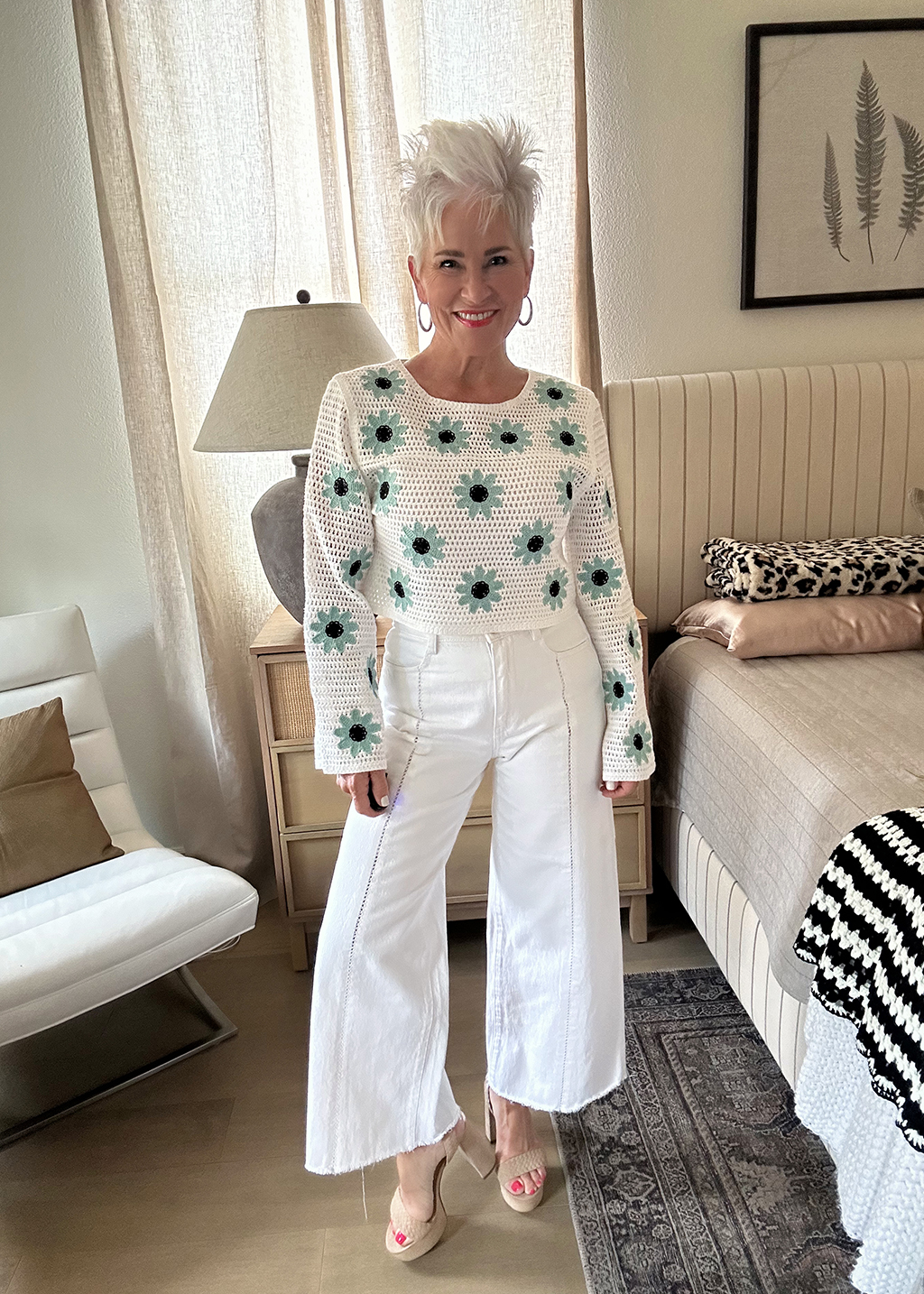 Wear your crochet with a classic linen wide-leg pant. I loved the pop of color with the shoes, but a fun platform sandal would look great too.